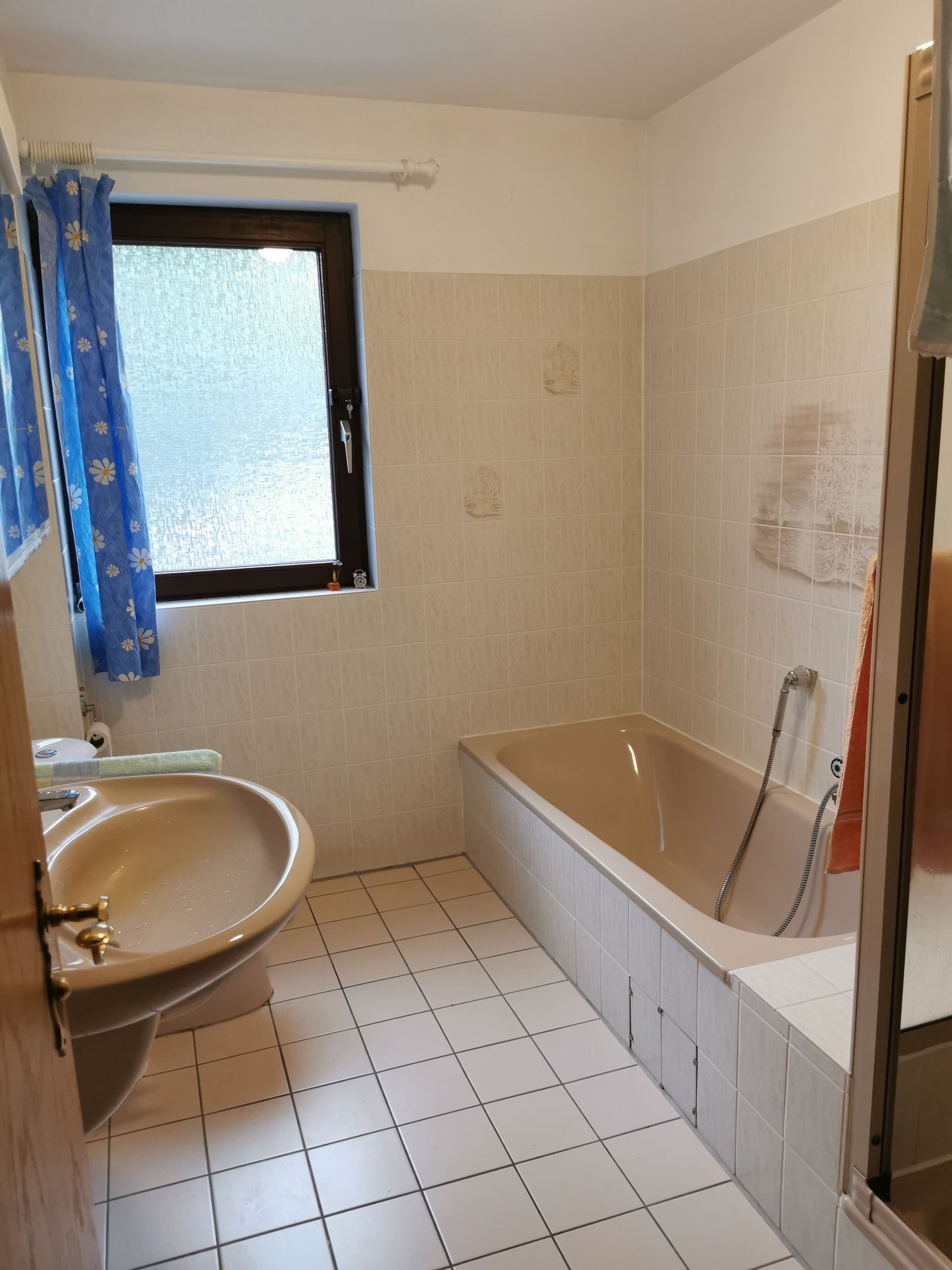 Barrierefreier Badumbau vorher/nachher auf Kundenwunsch wurde ein spezieller Zuschnitt von 60er Fliesen vorgenommen und in eine Art römischen Verband verlegt. Diese Bearbeitung ist sehr arbeitsintensiv, da jede Fliese geschnitten und geschliffen werden muss.